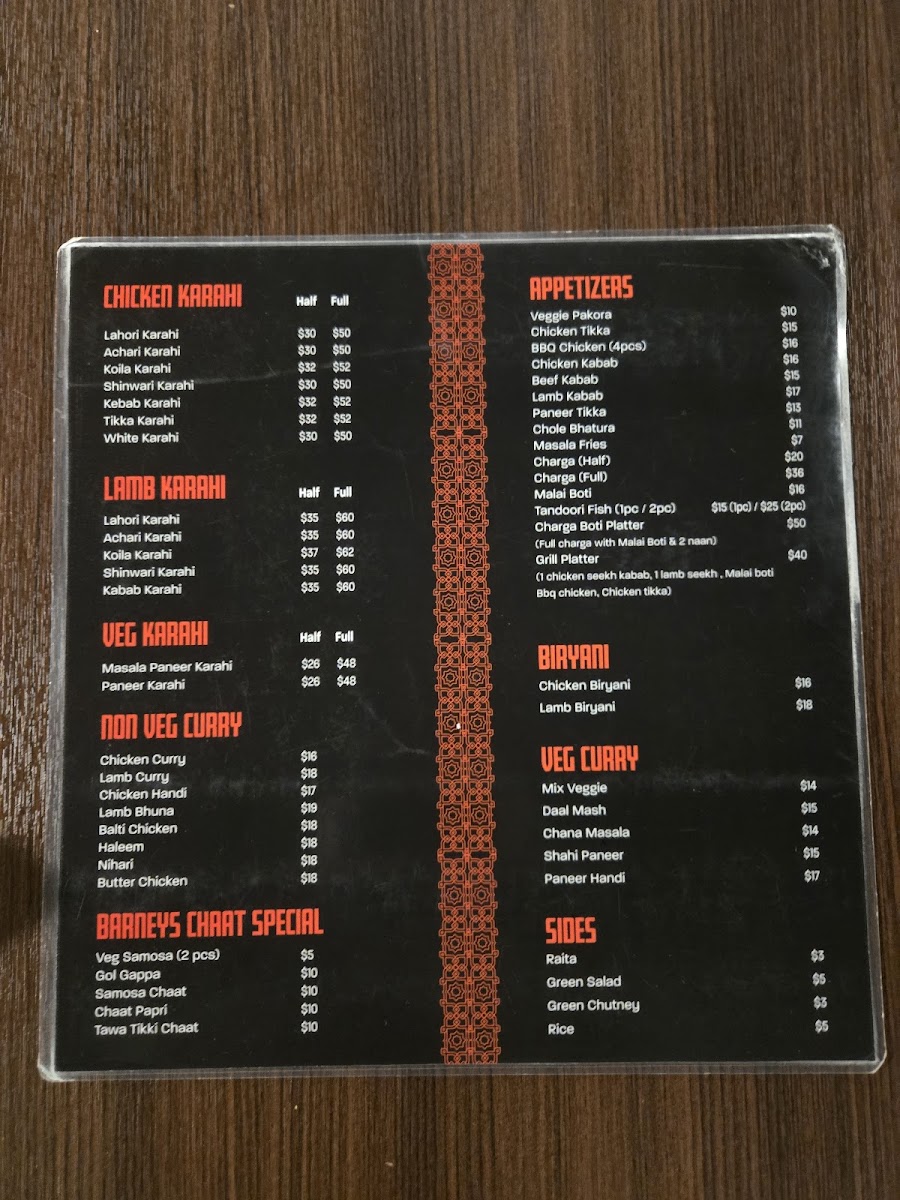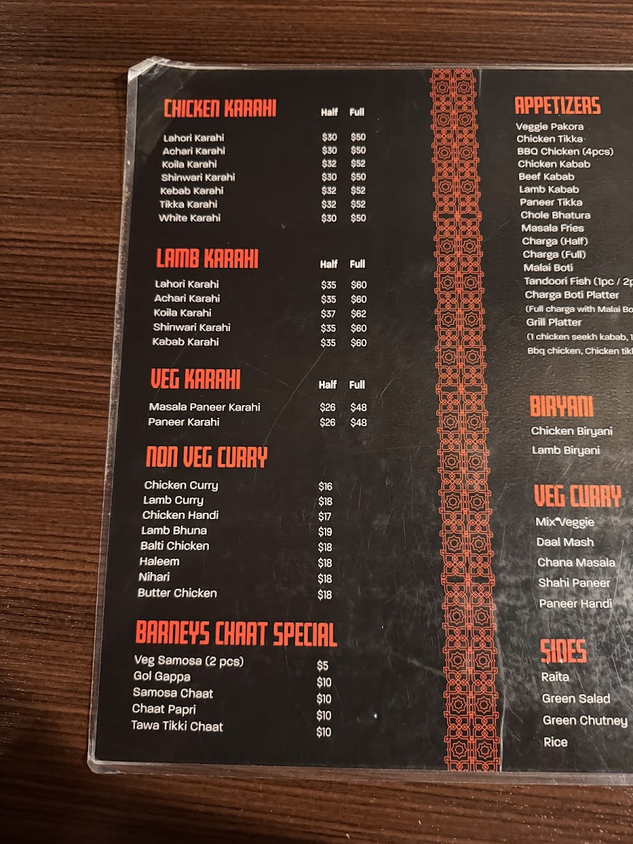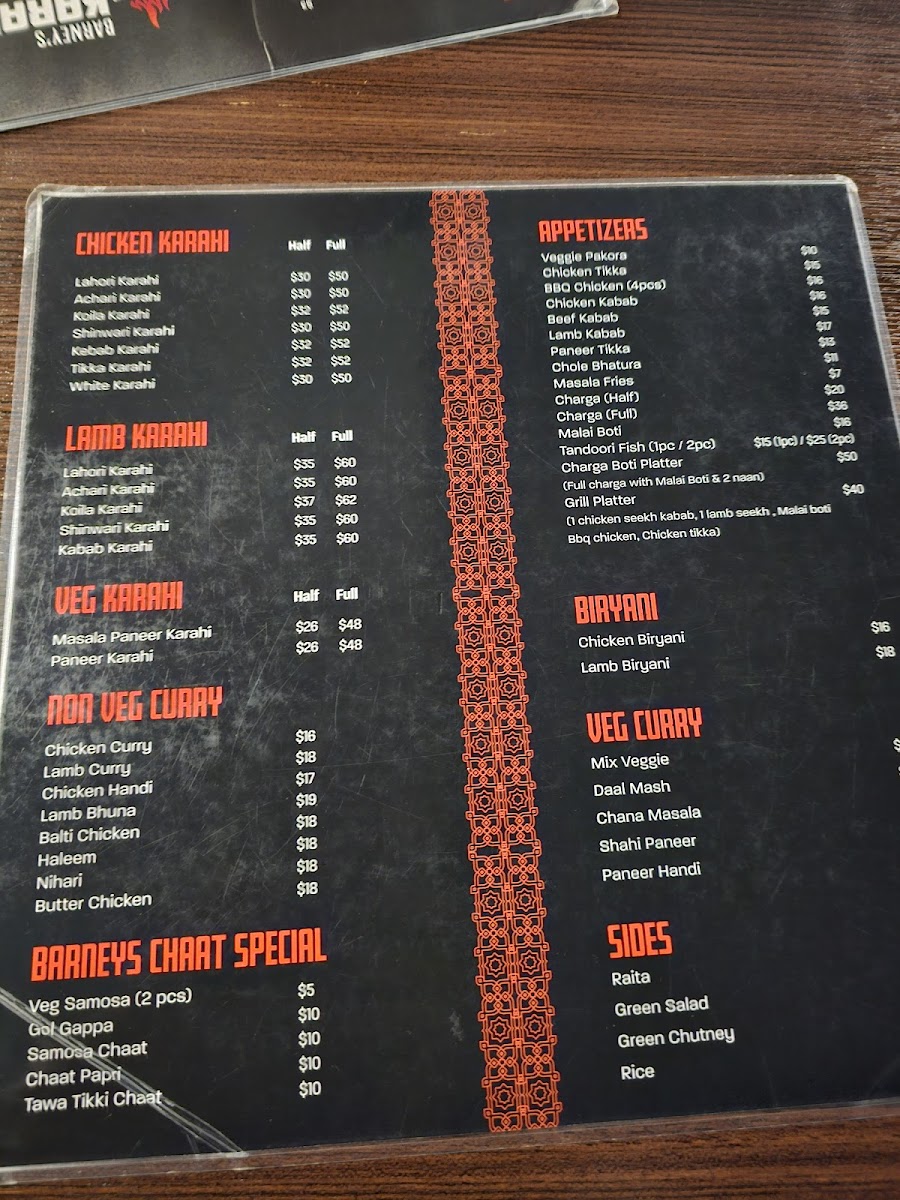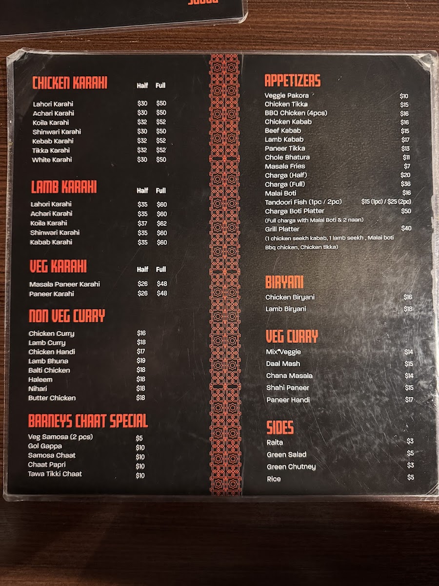 The menu at Barney's Karahiwala Restaurant features a variety of traditional Pakistani and Indian dishes. It is organized to offer a range of main courses, grilled items, breads, accompaniments, and desserts. Main dishes include classic preparations such as Chicken Biryani, Peshwari Goat Karahi, Lahori Kadhayi Chicken Karahi, and various Karahi specialties with options featuring chicken, lamb, and goat.