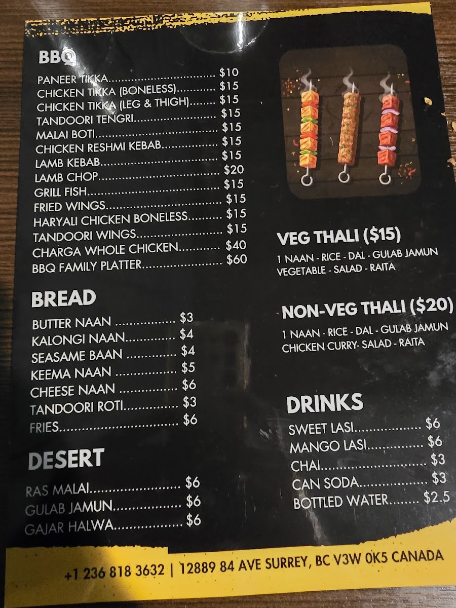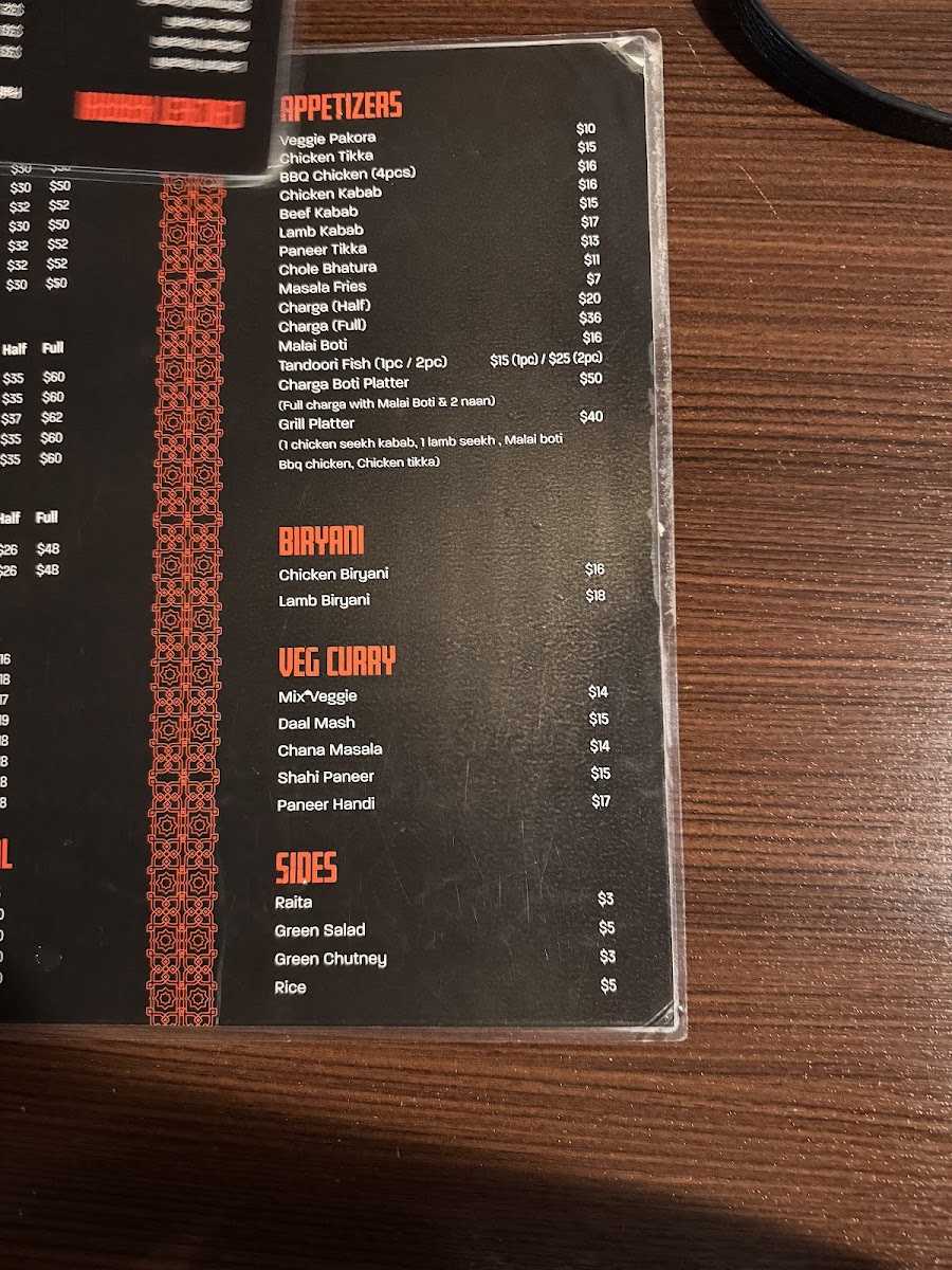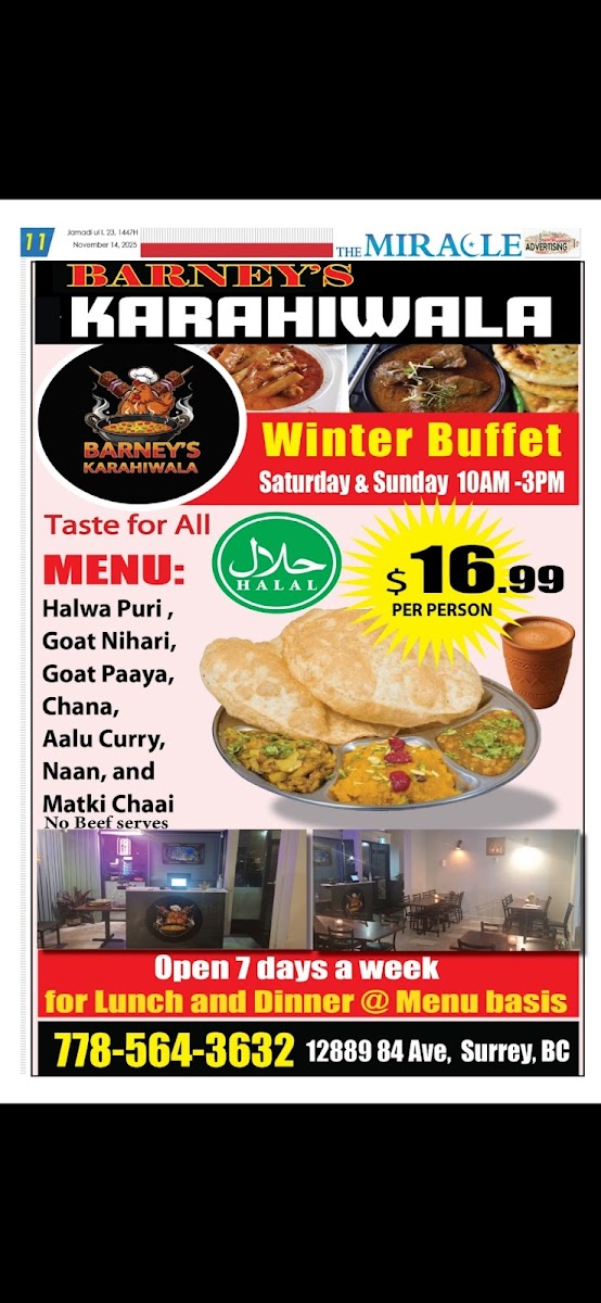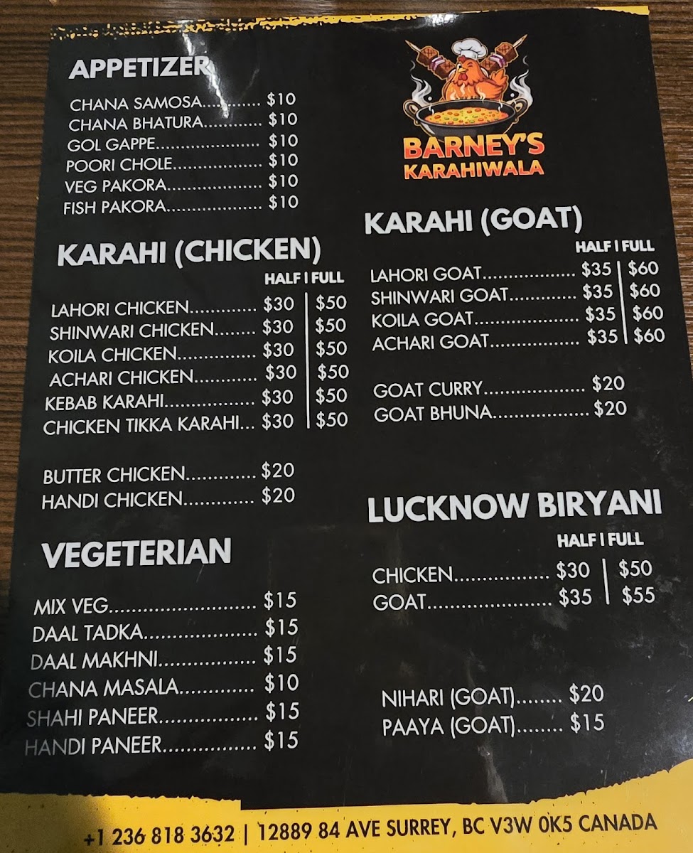 The menu at Barney's Karahiwala Restaurant features a variety of traditional Pakistani and Indian dishes. It is organized to offer a range of main courses, grilled items, breads, accompaniments, and desserts. Main dishes include classic preparations such as Chicken Biryani, Peshwari Goat Karahi, Lahori Kadhayi Chicken Karahi, and various Karahi specialties with options featuring chicken, lamb, and goat.